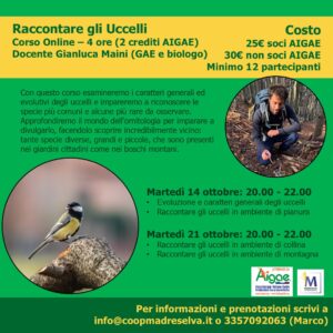 Con questo corso esamineremo i caratteri generali ed evolutivi degli uccelli e impareremo a riconoscere le specie più comuni e alcune più rare da osservare. Approfondiremo il mondo dell’ornitologia per imparare a divulgarlo, facendolo scoprire incredibilmente vicino: tante specie diverse, grandi e piccole, che sono presenti nei giardini cittadini come nei boschi montani.