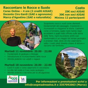 Scopriremo rocce e suoli come elementi fondamentali del paesaggio, imparando a riconoscerli e a leggerne le storie. Capiremo come si formano, quale ruolo hanno negli ecosistemi e quali indizi offrono sulla storia della Terra. Ogni escursione potrà così trasformarsi in un viaggio tra tempo geologico e processi vitali, dove ciò che osserviamo sotto i nostri piedi diventa chiave di lettura e racconto del