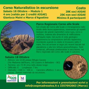 Sul crinale del Corno alle Scale ci immergeremo nello studio della fauna appenninica, osservando gli aspetti biologici dei grandi mammiferi come lupo, cervo e muflone, insieme alle dinamiche di nidificazione dell’aquila reale. Dal punto di vista geologico esploreremo la composizione dell’alto Appennino, ricordando quando le creste si trovavano sotto il mare, fino ad arrivare ai segni più recenti lasciati dal glacialismo e alla loro lettura geomorfologica. Tenti contenuti, affrontati direttamente in escursione, nel Parco regionale del Corno alle Scale in autunno.