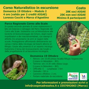 In questa seconda giornata di corso esploreremo il lato più boscoso e selvaggio del Parco Regionale del Corno alle Scale. Inizieremo con un’introduzione alle tecniche di biomonitoraggio dei licheni, degli insetti impollinatori e dei macroinvertebrati, con esempi di attività che proponiamo da anni ai ragazzi delle scuole. Proseguiremo affrontando direttamente sul campo il tema della micologia nel boschi attorno al Rifugio. Grazie alla presenza di un esperto micologo tratteremo il tema del riconoscimento dei funghi e della progettazione di un’escursione micologica.